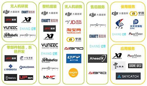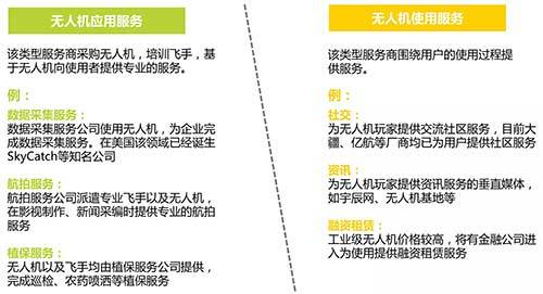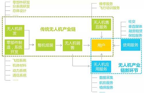 无人机产业链除了传统的生产制造环节外,还出现了针对用户使用过程的社交、保险等服务,以及数据采集、航拍服务等基于应用场景的专业服务。
