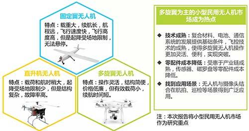 随着技术成熟,零配件成本降低,并且开发了航拍、电力巡检等应用场景,以多旋翼无人机为主小型民用无人机市场成为热点。