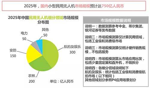 预计到2025年,国内无人机航拍市场规模约为300亿,农林植保约为200亿,安防市场约为150亿,电力巡检约为50亿,总规模将达750亿。