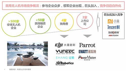 目前全球共有超过500家无人机公司,获得融资企业不足50家,其中约有4家公司估值超过10亿美金,有两家上市公司,行业竞争日趋白热化。
