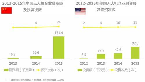 中国获投无人机企业数多于美国,总体融资金额高于美国,美国企业单笔融资金额较高;