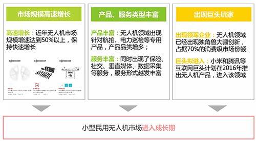 小型民用无人机市场规模高速增长,产品服务类型日益丰富,并且出现独角兽大疆创新,标志着行业已经进入成长期。