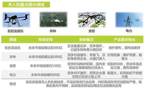 航拍及娱乐、农林、安防、电力四大领域是无人机市场的重点细分领域。