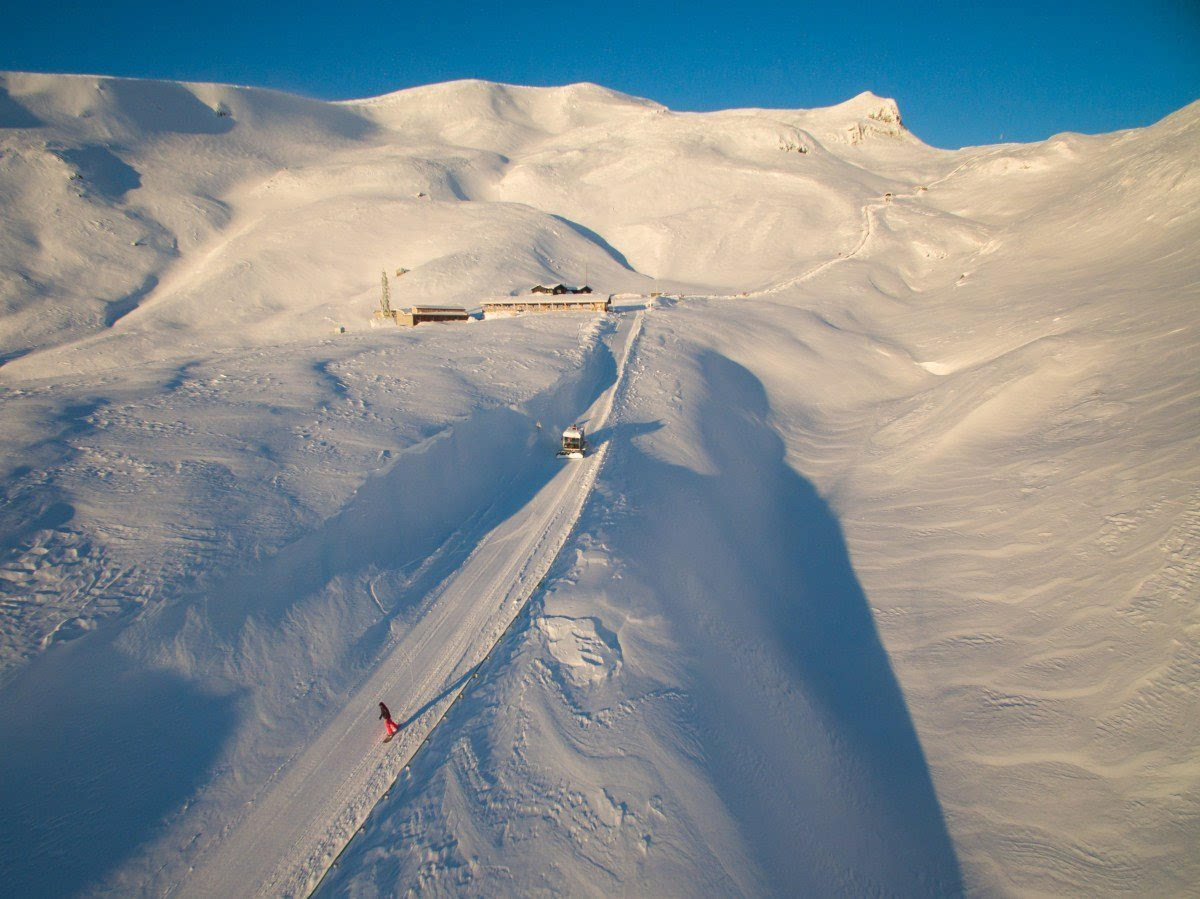 然后,我的拍摄变得有趣得多。我能够坐在温暖的履带车里,而我的朋友正用滑雪板下山。所以我的想法是试图跟随他一路下山。让无人机按照你的要求,翻转,向后飞行都是很简单的,你能因此拍到许多很多的照片,但是你也会迷失,你猜怎么着,我就迷失了。所以问题是履带车一点也不灵活,它相当缓慢,而我的朋友在滑雪板上速度非常快。我在履带车上不断更新着“原点”,以防一旦发生了问题我丢失了信号,Phantom至少能飞回到我们开过的地方,我们可以轻易地找到。但我猜无人机跟着滑雪者飞得太远了,我丢失了很久的信号,我开始担心,走出了履带车,向前进相反的反向跑去,最终在大概30秒之后我发现无人机已经飞回了之前设置的原点。然而问题是,我为了防止坠毁而设置的“失控保护”高度大概是200米,所以一接收到信号,Phantom就带着最后的35%电量开始在空中爬升。万幸的是,我成功在屏幕上找到了我自己,最终得意安全降落。
