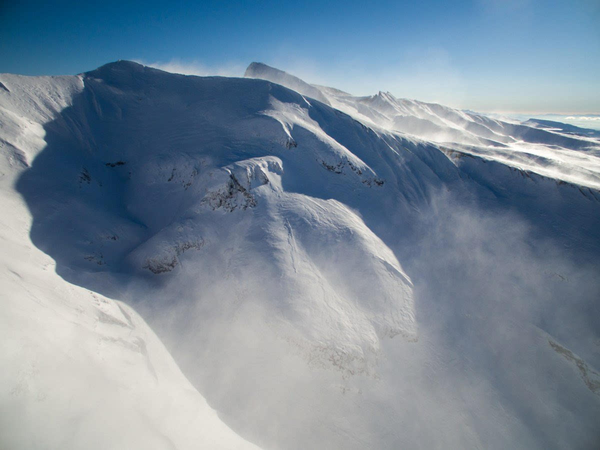 这张照片的拍摄高度相对低一些。当时风十分凛冽,雪花飞舞如同烟雾,让山看起来像是活着在呼吸一般。出乎意料的事,Phantom 3轻而易举地承受住了大风,这让我印象深刻。确保飞得不要太快,不然无人机的机翼会出现在画面中。在强风下即使你没动任何地方,机翼也会进入画面中。我使用一部屏幕5.5英寸大小的手机作为监视器,因此并没有太多的屏幕空间能让我看清楚究竟发生了什么,所以这就是为什么我喜欢从屏幕中心向下滑,隐藏所有信息,以确保画面的角角落落都没有机翼或者螺旋桨的影子。对了,再轻触一下屏幕,所有信息就又会回来。