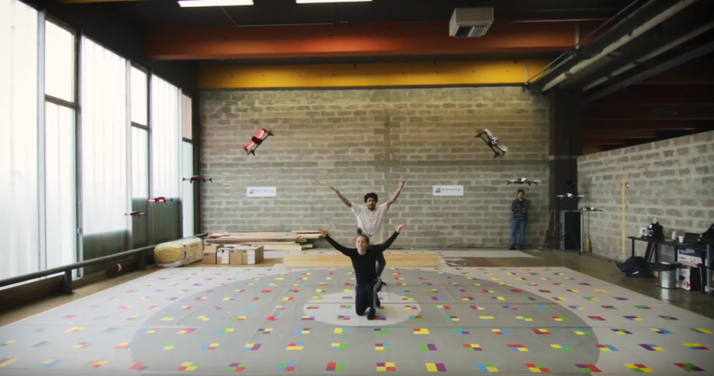 从现场观察可以发现,地板上不同颜色和图形组成的标志是关键, Parrot Bebop 2无人机底部有超声波和视觉传感器,利用计算机编程,无人机便可以自主飞行完成各种动作,包括空翻。