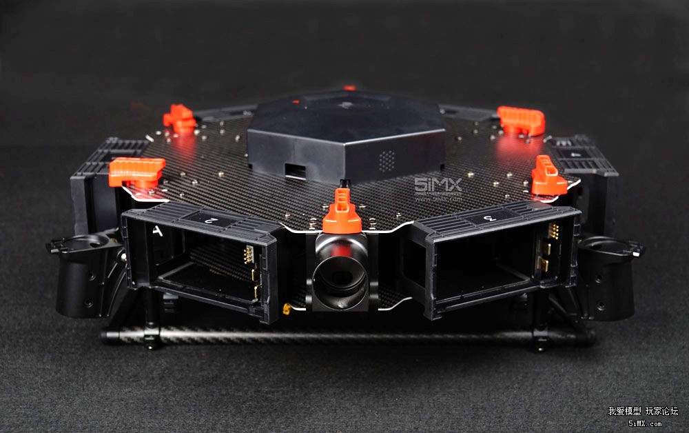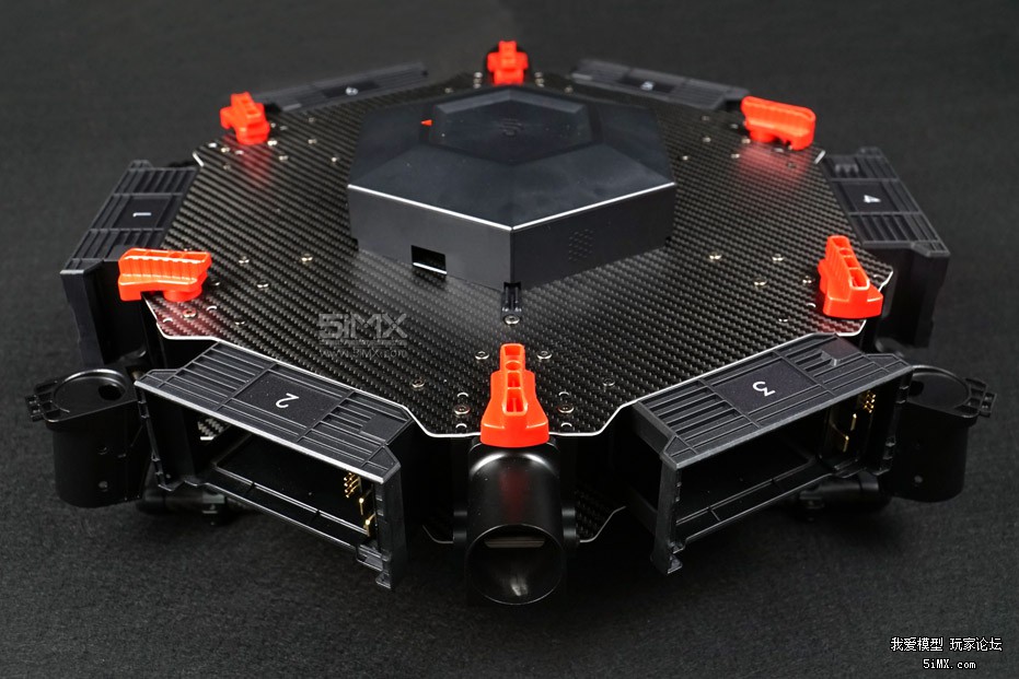 机身6个机臂连接位置以及6组电池仓位非常明显,顶上的防水盖可以打开,下面就是飞控。