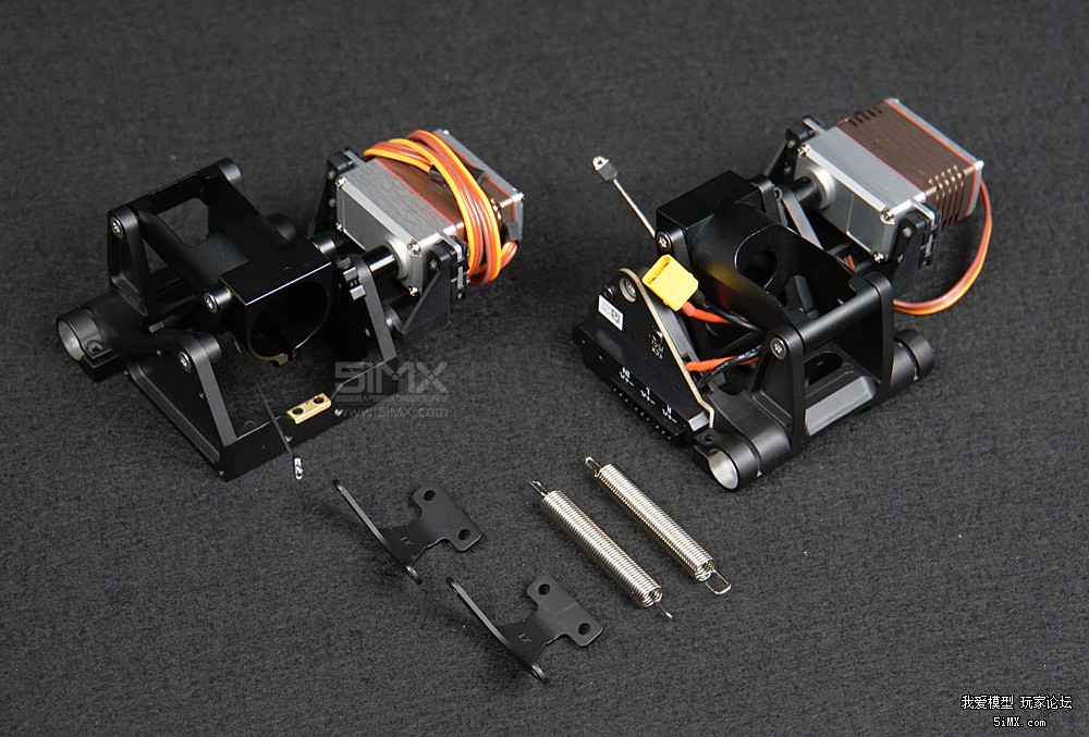 起落架部分,由4根碳纤维管、2个收放装置(舵机)和弹簧固定卡座构成。