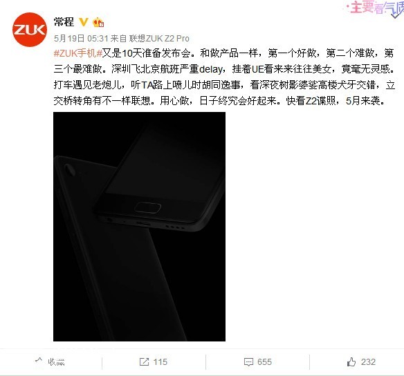 在去年的时候新晋互联网品牌 ZUK推出了旗下专为重度使用打造的首款手机Z1,在大家期待下一代产品Z2的时候ZUK却推出了Z2 Pro,就在大家以为不会有ZUK Z2的时候, 联想集团高级副总裁、移动业务集团联席总裁陈旭东就在微博中放出了ZUK Z2的渲染图,随后ZUK CEO更是爆出了关于ZUK Z2处理器的重磅消息。