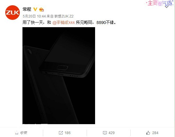 ZUK 首席执行官在微博上表示“用了快一天,和 @李楠或kkk 所见略同,8890不错。”虽然只是简单的一句话,但我们却能从中获取许多重要信息,从微博的 小尾巴和常程总说到的用了一天我们猜测新机离正式发布已经不远了,而8890应该会是三星的Exynos 8890处理器,至于为何@李楠想必是因为此前 魅族手机一直在用Exynos处理器。