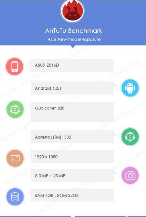 安兔兔的的爆料显示,这款华硕新机的代号为 Z016D,它搭载骁龙 820 处理器,采用 1080p 显示屏,内置 4GB RAM+32GB ROM 存储组合,提供前置 800 万 + 后置 2300 万像素摄像头,运行 Android 6.0.1 操作系统,目前提交跑分为 13.5 万。