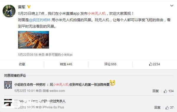 就在不久,小米董事长雷军在微博上宣布,本月 25 日将发布小米无人机。 雷军在微博上强调,5 月 25 日晚上,他们将用小米直播 app 发布小米无人机。对于这款产品,雷军强调,玩无人机,让每个人都可以享受飞翔的自由,看到平时无法看到的风景。