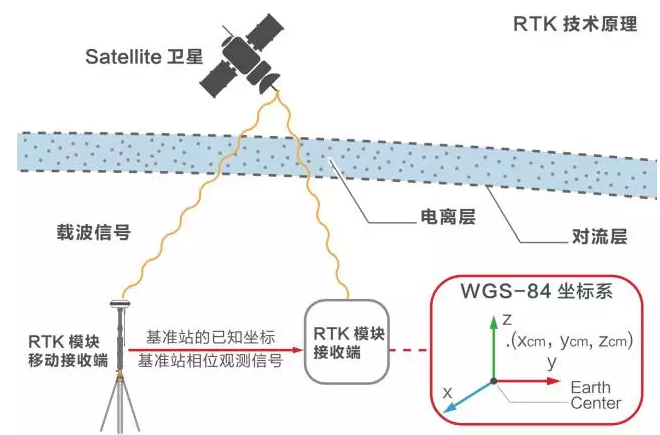 (2)增设已知自身精确坐标的基站,实时地把观测数据(相位观测值)及已知数据(精确坐标)传输给RTK模块,以此消除卫星钟误差、星历误差,并修正信号在电离层、对流层中传播的误差。