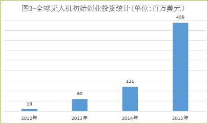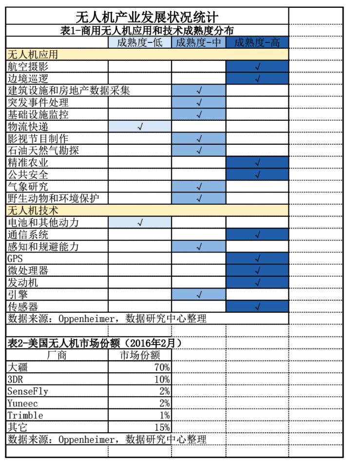 美国金融服务公司Oppenheimer于2016年2月发布了《无人机行业报告》,主要观点包括:航拍应用发展良好,物流快递尚未成熟,电池和其他动力技术依旧是最大制约;美国无人机市场,大疆一家独大;资本涌入,企业融资金额成倍增长,2015年无人机领域的初始创业投资金额是2014年的3-4倍。