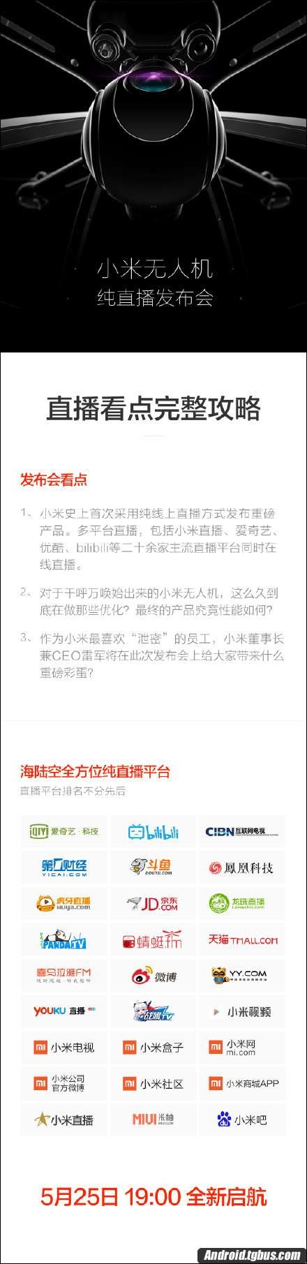 5月25日19:00,预热已久的小米无人机就要正式和大家见面了,相信很多米粉们都很期待这款产品的到来,同时大家更想第一时间知道它的真面目。因此小米无人机在哪直播便成为大家关注的焦点