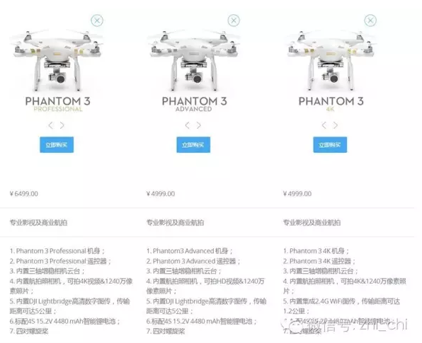 上图是大疆官网对其精灵3系列产品的不同版本对比。其中小米无人机纸面参数最接近于精灵3 4K版:参数接近的相机、同样的光流+超声波配置、相似的图传距离。