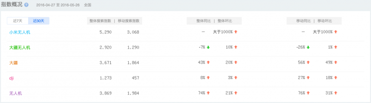 在小米无人机发布之前,雷锋网发现一个非常有意思的现象:无论用Google、还是百度,搜索“小米无人机”和“大疆无人机”,两者的搜索条目旗鼓相当。而在搜索指数方面,小米无人机的发布几乎拉高了所有关于无人机的关键词,其中也包括大疆。
