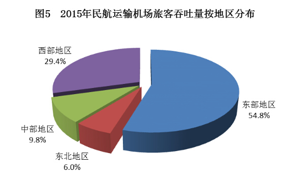 其中:2015年东部地区完成旅客吞吐量5.02亿人次,东北地区完成旅客吞吐量0.55亿人次,中部地区完成旅客吞吐量0.90亿人次,西部地区完成旅客吞吐量2.69亿人次。