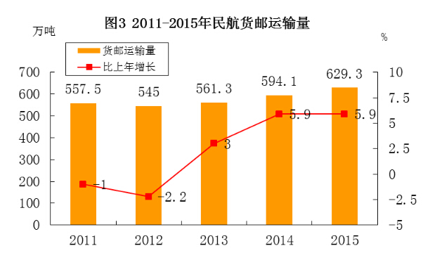 2015年,全行业完成货邮运输量629.3万吨,比上年增长5.9%。国内航线完成货邮运输量442.4万吨,比上年增长3.9%,其中港澳台航线完成22.1万吨,比上年减少1.0%;国际航线完成货邮运输量186.8万吨,比上年增长10.9%。