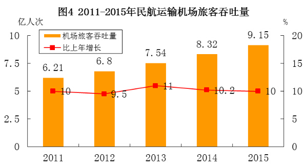 2015年,全国民航运输机场完成旅客吞吐量9.15亿人次,比上年增长10.0%。