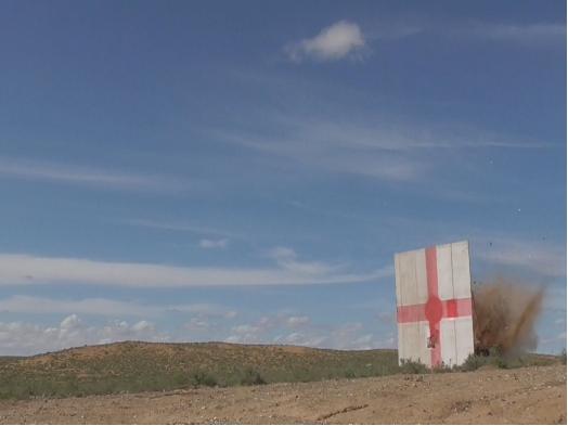 导弹穿透靶标后激起一片尘土。
