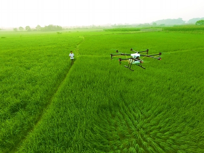 6月9日,江西九江县港口街镇茶岭村,一位种粮大户利用植保无人机向水稻喷洒农药。植保无人机每小时可喷洒40~60亩水田,作业效率是人工喷洒的40倍以上。