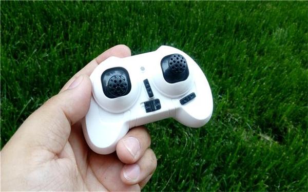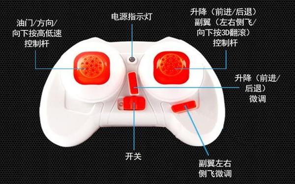 cx-10w的遥控手柄也很小巧,黑白配的外形也很讨人喜欢。主要有一灯(电源指示灯)、一个开关(无线启动开关)、两个按键(飞行状态微调用)、两个控制杆(飞行高度、飞行方向等控制)。详见下图(图片来自网络)。