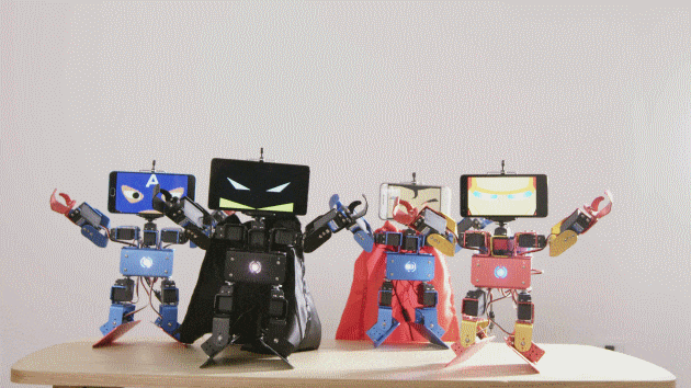 IronBot 仅需通过一部手机即可通过无线操控其中的控制马达,简单达成各式动作甚至是进行游戏。更有意思的是,你也可以直接把手机扣上人型机器人的头顶,让它通过手机的 app 显示出各式有趣的卡通表情,并可通过前置镜头与孩童进行互动学习动作一起共舞,甚至通过简单的语音指令帮忙你们来个 IronBot 式的自拍。做为一位称职的「好伙伴」,这个 DIY 机器人还可自由设定机器人的名称、性格、声音乃至于动画表情等,提供孩子各种乐趣。
