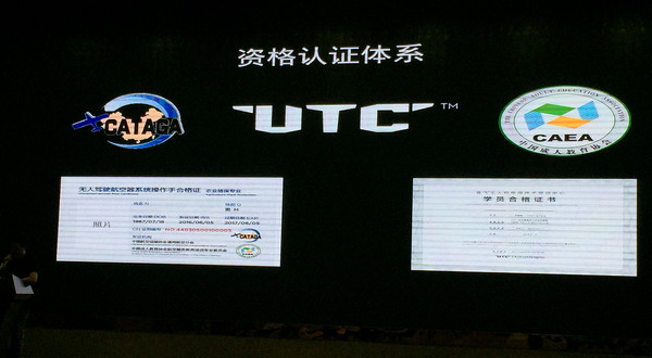 UTC证书,这是参加“慧飞”无人机行业应用培训中心后,通过认证考试后获得的证书,现阶段只有农业植保机专业。这是DJI大疆创新与两大机构联合认证的证书标准,这两大协会是中国航空运输协会通用航空分会(General Aviation Commitee of China Air Transportation Association ,CATAGA)和中国成人教育协会(China Adult Education Association,缩写CAEA)。其中,CATAGA是中国民航局主管的航空运输协会下属的通航委员会分会,是中国民航局主管的航空运输协会下属的通航委员会分会,经国家民政部批准的中国航空运输协会分支机构,受中国航空运输协会和中国民用航空局的业务指导和监督管理;CAEA则是1981年4月经中华人民共和国教育部批准、中华人民共和国民政部注册成立,主要是成人教育团体和成人教育工作者自愿组成的群众性、学术性社会团体。