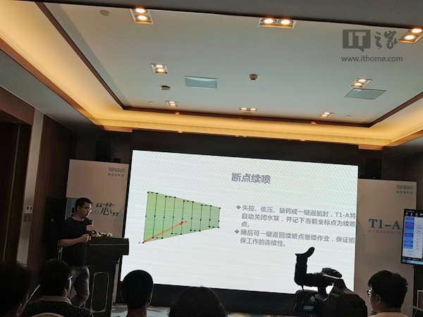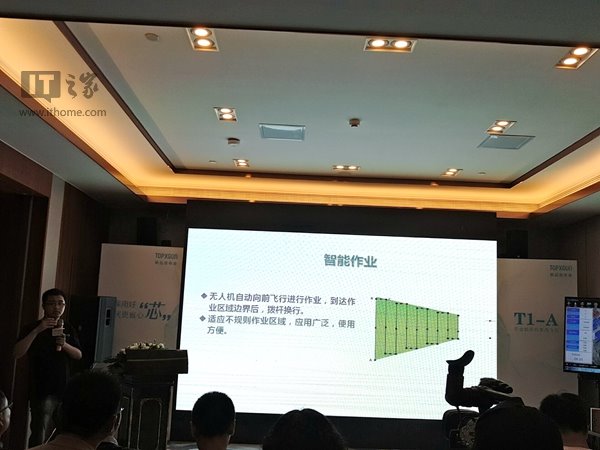 在现场,拓攻演示了搭载T1-A飞控的无人机智能化的植保操作模式,相比传统的植保无人机操作方式的提升主要体现在精准和便捷性方面,整个过程可以基本实现自动化。此外,拓攻也派出技术人员进行户外演示与讲解,展示了拓攻植保无人机飞控T1-A的真实情况。