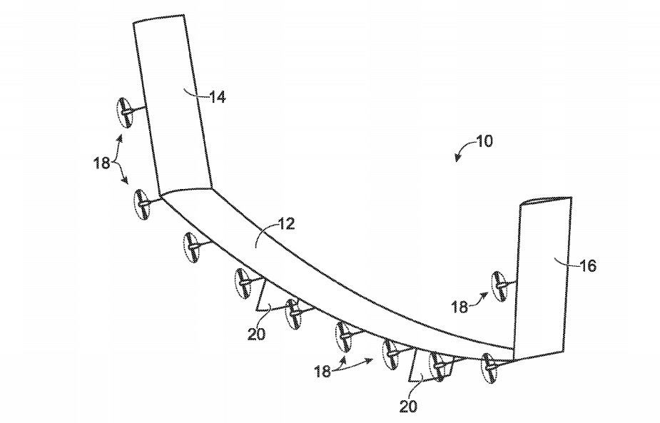 这家公司于 5 月底向美国专利及商标局(USPTO)申请了一项太阳能飞机的专利。这架太阳能无人机的设计看起来略奇怪,主体部分的机翼边上还有两块小型机翼向上折起,这三个部分都覆盖着太阳能电池板用以吸收能量。
