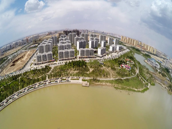 这是航拍的兰州新区2号人工湖畔已经交付使用的居民小区(7月20日摄)。