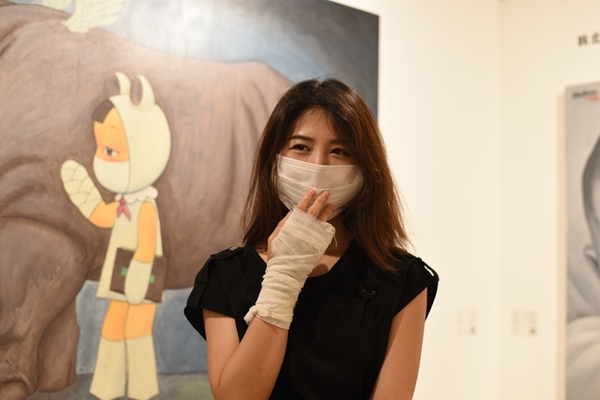 贝娃十年新作《异娃》(不一样的孩子)引嘉宾画作前流连忘返,此次画展上亦是“全球首发”。戴着口罩的贝娃经过奈良美智画展作品“吸烟的孩子”前,十分巧妙地暗喻了贝娃的主旨精神。