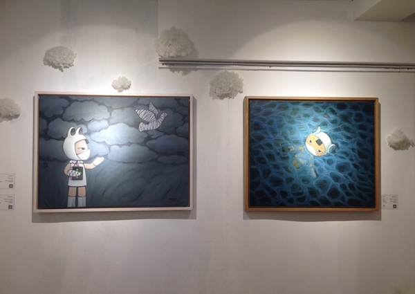 艺术展一角,贝娃《放鸽子》&《水深处》。