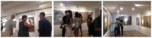 此次艺术展可圈可点的是,策展人墨妮(Moony)将一场单纯的画展插上了想象的翅膀,并引用了艺术家韩北石先生“口罩贝娃”的重要特征,不仅在展览现场注入了鲜活的口罩元素:如口罩装置(“口罩船只”、“霾口罩”等)、剪纸口罩现场留言、戴口罩现场留影、戴着口罩的交流与讲座聆听等十分有意思、又引人反思的互动环节,受到了现场观众的十分肯定。