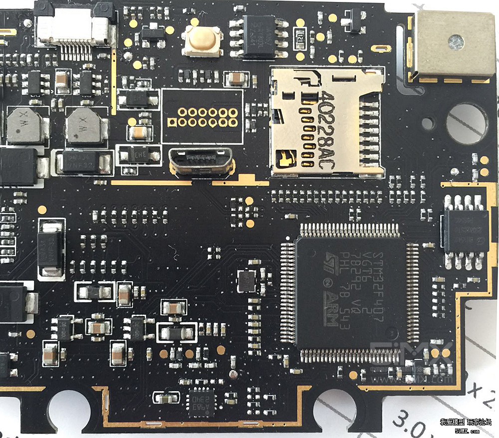 打开屏蔽盖,可见飞控主控芯片型号为ARM STM32 F407 VGT6,该系列芯片由意法半导体(ST)出品,属先进的基于ARM 32位内核的微控制器,其内核是ARM Cortex™-M4F。对于无人机来说决定性能高低的关键并不全在于飞空芯片的处理能力,而是算法(多重数据融合能力)。不要忘了,小米比精灵3还多一套视觉传感系统。