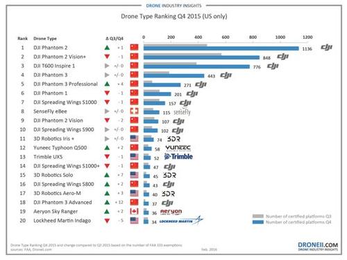 截至2015年第四季度,在美国联邦航天管理局(FAA)已通过的商业无人机准飞许可的申请中,排名前20的热门机型中有12个来自大疆。
