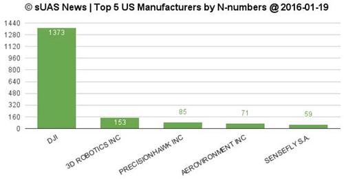看完权威的FAA机构数据统计,再对比一下第三方统计平台sUAS的无人机注册信息统计数量,TOP 5的注册,1月初(截止2016年1月19日)专业用户注册数据,大疆以1373高居第一,占TOP5注册总量的78.8%。3DR排名第二,占TOP5注册总量的8.7%。这个统计数据虽然不及FAA官方数据权威,但也足够反映出主流消费级无人机的市场占有情况。消费级无人机仍然是大疆(DJI)一家独大。其他无人机厂商凑整为零也不及第一名的零头。