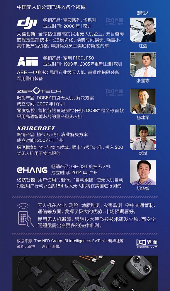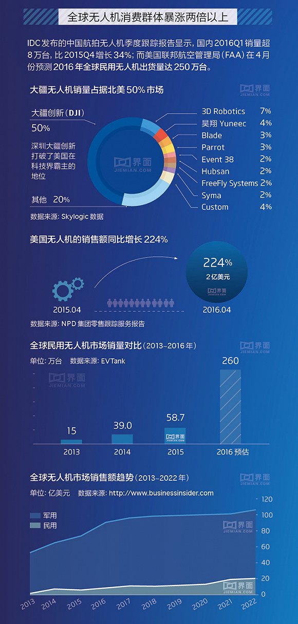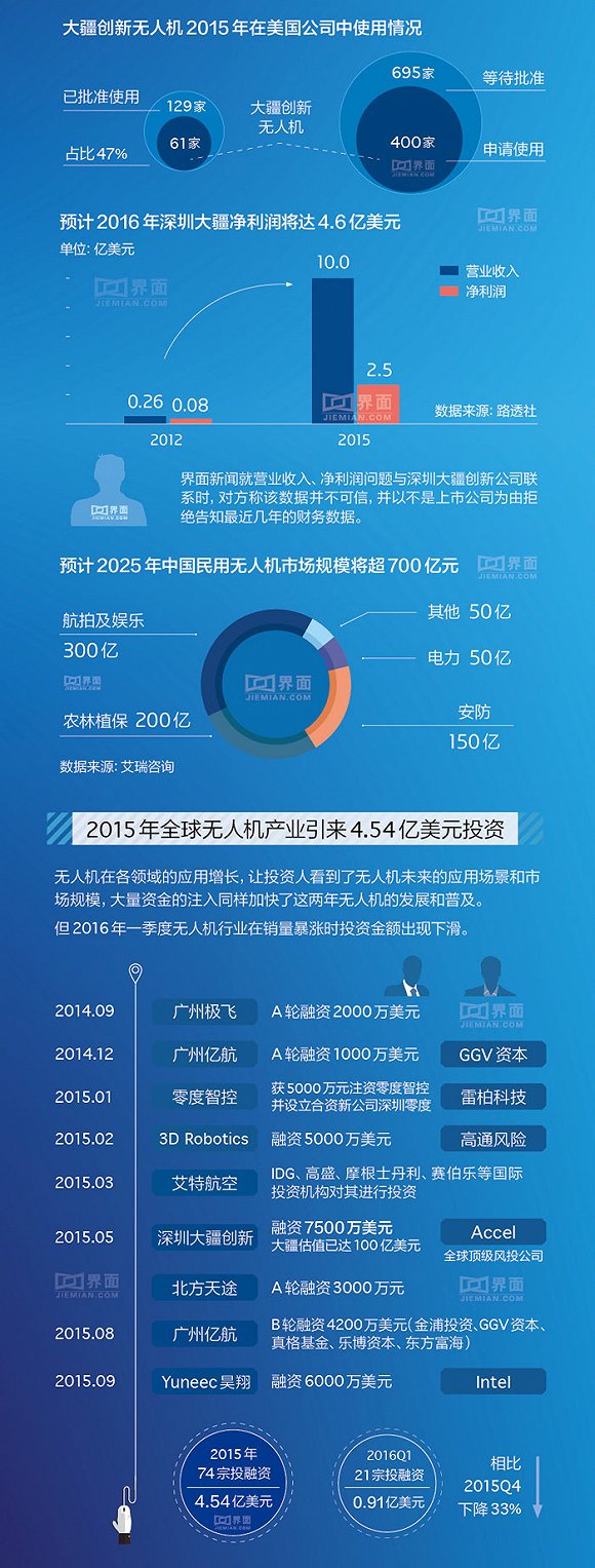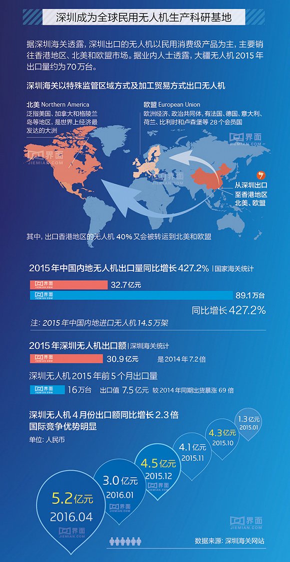 2015年中国内地无人机出口量同比增长427.2%,深圳成为全球民用无人机生产科研基地。另外预计2025年中国民用无人机市场规模将超过700亿元。请看新闻对民...