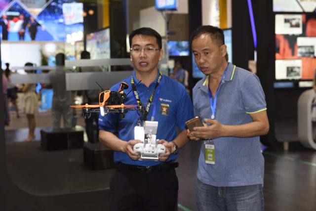 6月24日,参展商(左一)在向观众演示用于飞行比赛的无人机操控。