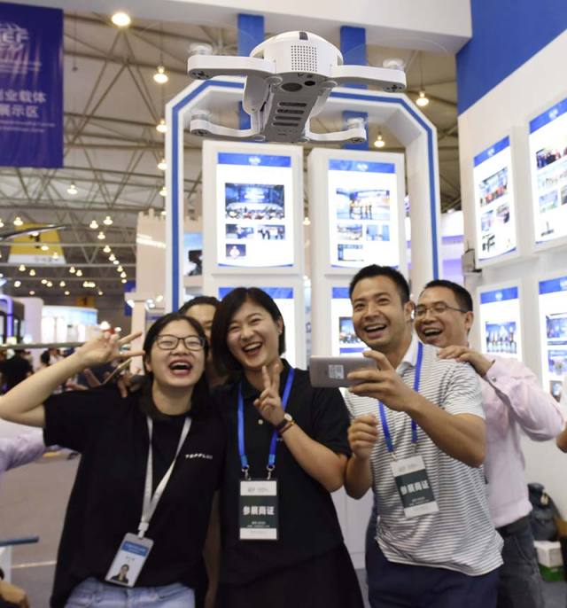 6月24日,观众在使用由成都本土科技公司研发的自拍专用无人机合影。