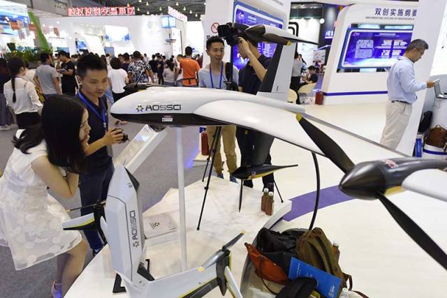 6月24日,观众在参观展出的无人机。