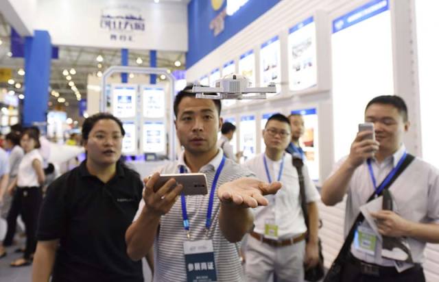 6月24日,观众用手机操控由成都通甲优博科技公司研发的自拍专用无人机从手中起飞。