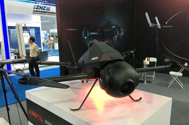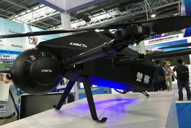 无人机发展迅速,在我国,无人机市场在商业航拍、电影拍摄等领域获得了前所未有的发展,大疆、零度智控主打多旋翼机占了很大商业市场,随着警用需求,越来越多的无人机出现在警务工作和军事用途。在6月22日举办的“ASFC•尖兵之翼—第七届中国无人机大会暨展览会”上,深圳领航公司研制的一款警用无人机吸引了众多关注,该无人机造型科幻,头部安装了一台光电侦察吊舱。
