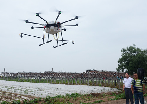 随着螺旋桨“呼呼”转动,一架遥控无人飞机缓缓升空,向前飞向田间时洒下一道白雾。这是6月23日在平度市古岘镇,当地农资公司帮助贫困户免费喷药的情景展示。