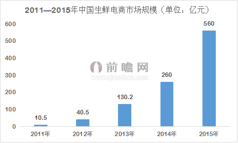2011年,我国生鲜电商市场规模仅为10.5亿元,到2012年增至40.5亿元,同比增长286%,到2013年生鲜电商市场规模为130.2亿元,同比增长221%,2014年生鲜电商市场规模为260亿元,同比增长100%,2015年市场规模为560亿元,同比增长115%。