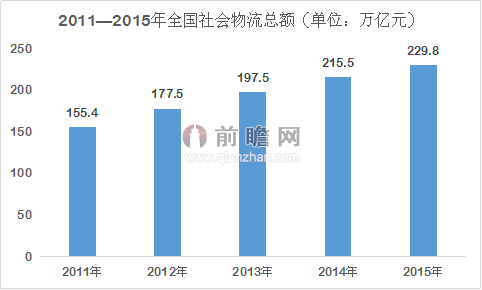 2011年我国全社会物流总额为155.4万亿元,到2015年全社会物流总额为229.8万亿元。从这五年间的发展全社会物流总额来看,我国物流业总体处于平稳发展期,增速开始变缓。