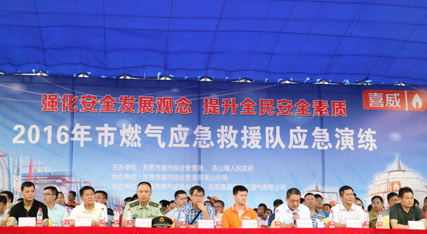 演练由市城市综合管理局、茶山镇人民政府主办,市城市综合管理局茶山分局协办,市燃气应急救援队、东莞喜威液化石油气有限公司承办。市城管局副局长郭显领、茶山镇党委委员吴剑洪、喜威(中国)投资有限公司安全技术总监李文深、东莞喜威液化石油气有限公司总经理谢金晋、市安委办、市应急办、市反恐办、市质量局、市公安消防局、市燃气行业协会和市安全生产协会负责人共约200人参加了本次演练活动。