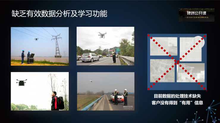 第三方面的缺陷,跟刚才一脉相承,既然大家都在做demo这种演示性的工作,其实没有在背后梳理出或得到更有效的数据,用户没有从中得到更有效的数据,更多的是飞机飞起来给了行业用户一个图片或者一段视频,他也不知道这个东西怎么用,也不知道哪块具体的输电线路坏了,怎么修,怎么跟企业的ERP结合起来,目前没有。这几方面缺陷或问题制约着无人机在商业领域的应用。