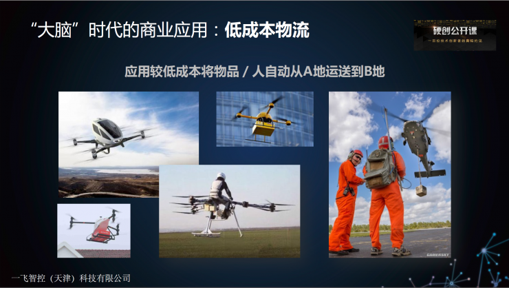 低成本物流其实不仅仅是运物品,其实人也是物流的一个很重要的方面。大家都知道Uber为什么要做自动驾驶汽车,他们认为出租车里面人的成本是最高的,如果把人这块成本砍掉,其实出租车的价格还会大幅度的下降。和这样的思想是类似的,其实现在通用航空里或者飞机运输里边,人的成本也是非常高的,所以亿航在未来发布了未来载人无人机的计划。